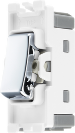 BG RPC12 Nexus Grid Polished Chrome 20AX 2 Way 1 Pole Switch Module About Product: Rating: 20 Amp, 20AX Inductive 2 Way, single pole Polished Chrome finish Minimum mounting box depth: 25mm Terminal capacity: 4 x 1mm², 4...