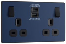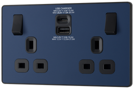 Matt Blue Evolve 2 Gang 13A 1x USB-QC A 27W 1x USB-PD C 30W Switched Socket - Black Insert