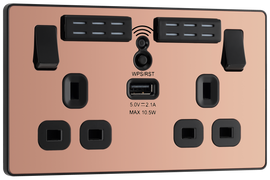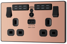 Polished Copper Evolve 2 Gang 13A 1x USB-A 2.1A Wi-FI Extender Switched Socket Outlet - Black Insert