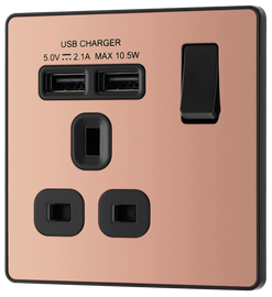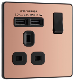 Polished Copper Evolve 1 Gang 13A 2x USB-A 2.1A Switched Socket Outlet - Black Insert