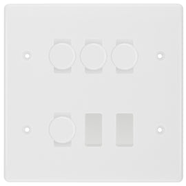 BG White Moulded 6 Gang Switch 4x Trailing Edge LED Dimmer, 1x Intermediate, 1x 2-Way Switch BG grid switch set combining intelligent trailing-edge LED dimmer, intermediate/2-way switch and standard 2-way switch — all in a sle...