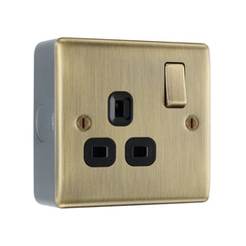 Nexus Metal Antique Brass Single 13A Switched Socket About Product: Top quality Antique Brass finish - lightly lacquered to prevent finger marks Matching Antique Brass rocker switch Black plastic insert Specification: 13...