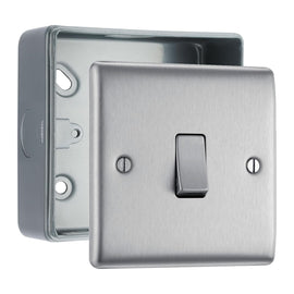 BG Nexus Brushed Steel 1 Gang 2 Way Light Switch & Surface Pattress Back Box