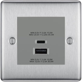 BG Nexus Brushed Steel 45W USB Wall Socket Euro Module USB-A & C - Grey Insert