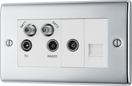 BG Nexus Metal Polished Chrome Quadplex Combination TV Socket NPC69B Double Socket with a TV, FM and 2 Satellite outlets plus a Return and telephone outlet Easy to install, supplied with fixing screws and installation instr...