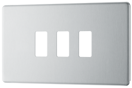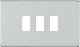 Triple Light Switch Plate (3 Gang, 2 Way) Brushed Steel 10A About Product: No visible plastic around switches Secure Screwless front Easy "clip on/off" plate Minimum back box depth: 16mm Sleek, flat profile Angled in-l...