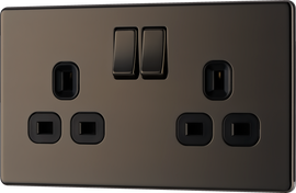 Switched Double Plug Socket (2 Gang) Black Nickel with 2 USB 3.1A Ports - Black Insert About Product: Nexus Metal Flat-Plate Black Nickel Profile with Black Insert 2 Gang switched socket with outboard rockers 2 x Type A U...