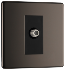Single Coaxial TV Outlet in Black Nickel About Product: No visible plastic around switches Screwless front secure & easy "clip on/off" plate Sleek flat profile Minimum back box depth: 25mm Integral gasket for moistu...