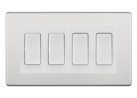 BG Screwless Brushed Steel 4-Gang Light Switch 2x 2-Way + 2x Intermediate – White Inserts