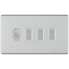 BG Screwless Brushed Steel 4 Gang Switch 1x Trailing Edge LED Dimmer 3x Intermediate Custom Grid Switch
