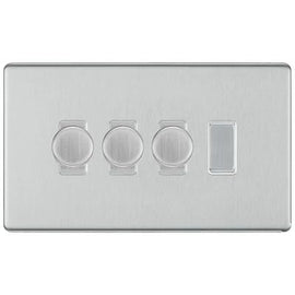 BG Screwless Brushed Steel 4 Gang Switch 3x Trailing Edge LED Dimmer 1x Intermediate Custom Grid Switch