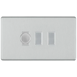 BG Screwless Brushed Steel 3 Gang Switch 1x Trailing Edge LED Dimmer 2x Intermediate Custom Grid Switch