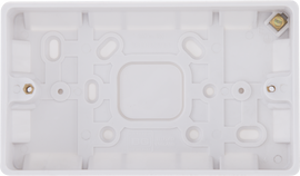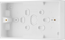 The BG Electrical Moulded 902 is a white double (2 gang) pattress box for socket outlets measuring 32mm deep.
