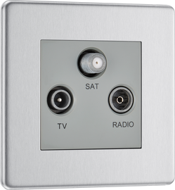 BG FBS67 Flatplate Screwless Triplex TV/FM/Sat socket - Screened, Brushed Steel - Grey Insert Supplied as kit of Euro Module components TV/FM mounting box depth 35mm