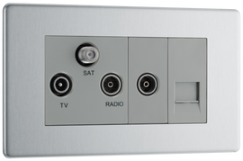 BG Screwless Brushed Steel Quadplex Combination TV Socket FBS69W Double Socket with a TV, FM and 2 Satellite outlets plus a Return and telephone outlet Easy to install, supplied with fixing screws and installation instructi...