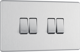 BG Brushed Steel Screwless 4 Gang 20AX 2-Way Switch Custom Grid - Black Insert