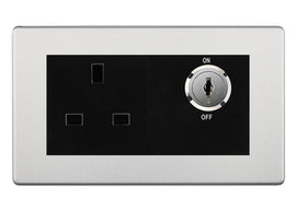 BG Screwless Brushed Steel 13A Double Pole Key Controlled Socket – Black Inserts