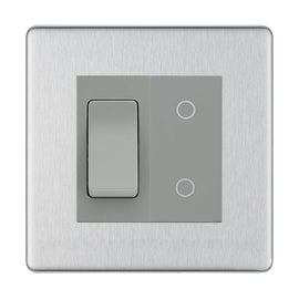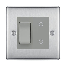 BG Brushed Steel 2 Gang Custom Switch 1x 2 Way Switch 1x Secondary Touch Dimmer Grey Inserts