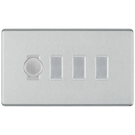 BG Brushed Steel Screwless 4 Gang Switch 1x Trailing Edge LED Dimmer 3x 2 Way