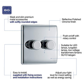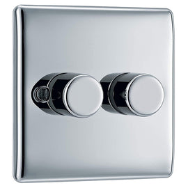 Nexus Flatplate Screwless Polished Chrome 2 Gang 200W 2 Way Trailing-Edge Push Dimmer Switch