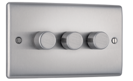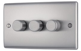 Nexus Flatplate Screwless Brushed Steel 3 Gang 200W 2 Way Trailing-Edge Push Dimmer Switch