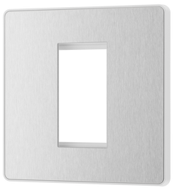 Screwless Flat-Plate 1 Module Euro Module Front Plate - Brushed Steel About Product: Square plate 1 module - 25 x 50mm Finish: Brushed Steel Screwless flat plate finish The BG Electrical Euro Module FBSEMS1 is a screwl...