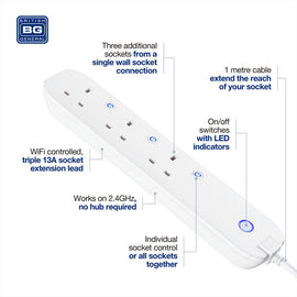 BG Smart EHC31 3 Gang Way Triple Socket Extension Lead 1m White Home App Control