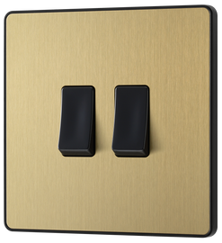 Satin Brass Evolve 2 Gang 20A 16AX 2 Way Light Switch - Black Insert About Product: 20A 16AX Rated Easy to install, supplied with fixing screws and installation instructions 2 way switching allows for a second switch posi...