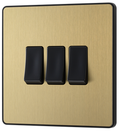 Satin Brass Evolve 3 Gang 20A 16AX 2 Way Light Switch - Black Insert About Product: 20A 16AX Rated Easy to install, supplied with fixing screws and installation instructions 2 way switching allows for a second switch posi...