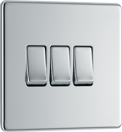 Triple Light Switch Plate (3 Gang, 2 Way) Polished Chrome 10A About Product: No visible plastic around switches Secure Screwless front Easy "clip on/off" plate Minimum back box depth: 16mm Sleek, flat profile Integral ...