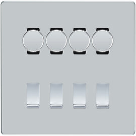 BG Screwless Polished Chrome 4 Gang Switch 2x Trailing Edge LED Dimmer 2x Intermediate Custom Grid Switch