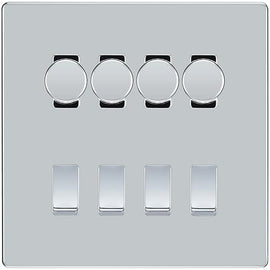 BG Screwless Polished Chrome 4 Gang Light Switch Grid – 2x Trailing-Edge LED Dimmer, 1x Intermediate, 1x 2-Way Switch