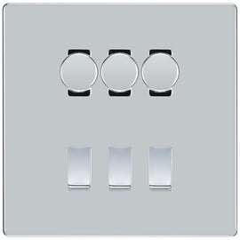 BG Screwless Polished Chrome 3 Gang Switch 2x Trailing Edge LED Dimmer 1x Intermediate Custom Grid Switch