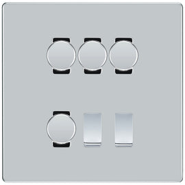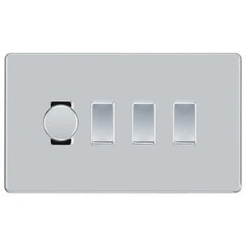 BG Screwless Polished Chrome 4 Gang Switch 3x Trailing Edge LED Dimmer 1x Intermediate Custom Grid Switch