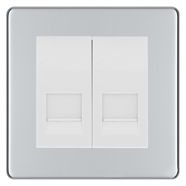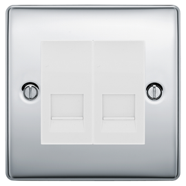 Flat-Plate Polished Chrome 2 Gang (2G) RJ45 Data Outlet Cat6 About Product: No visible plastic around switches Secure Screwless front Specification: 2 gang, RJ45 Cat6 data outlet socket Minimum back box depth: 35mm This...