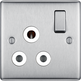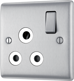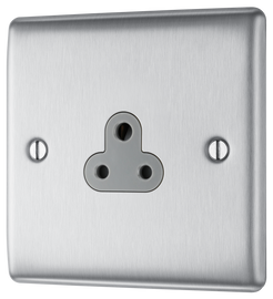 BG NBS29G Nexus 5A, unswitched socket round pin Brushed Steel 2/5/15A Manufactured to BS 546 Minimum mounting box depth 25mm Brushed Steel insert colours: White (W) & Grey (G)