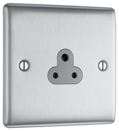 BG NBS28G Nexus 2A, unswitched socket round pin Brushed Steel 2/5/15A Manufactured to BS 546 Minimum mounting box depth 25mm Brushed Steel insert colours: White (W) & Grey (G)