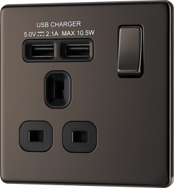 Single Plug Socket (1 Gang) Black Nickel with 2 USB 2.1A Ports - Black Insert