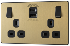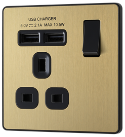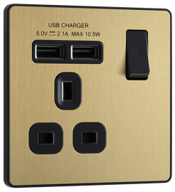 Satin Brass Evolve 1 Gang 13A 2x USB-A 2.1A Switched Socket Outlet - Black Insert