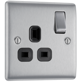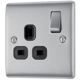 Nexus Metal Brushed Steel Single 13A Switched Socket - Black Insert