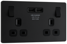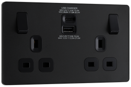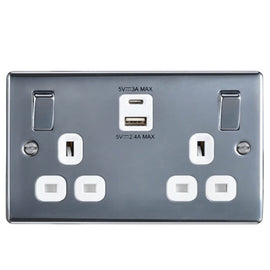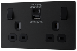 Matt Black Evolve 2 Gang 13A 1x USB-QC A 27W 1x USB-PD C 30W Switched Socket - Black Insert