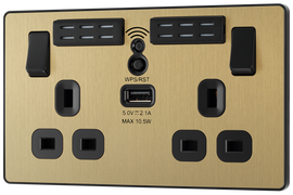 Satin Brass Evolve 2 Gang 13A 1x USB-A 2.1A Wi-FI Extender Switched Socket Outlet - Black Insert