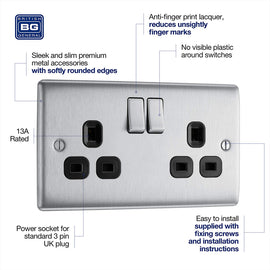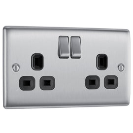 Nexus Metal Brushed Steel Double 13A Switched Socket - Black Insert