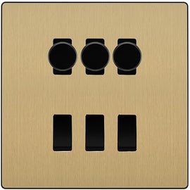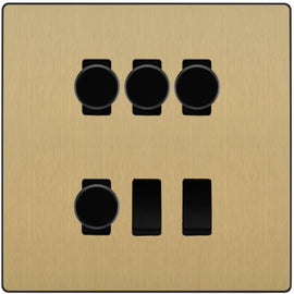 BG Evolve Satin Brass 6 Gang Switch 3x Trailing Edge LED Dimmer 3x Intermediate Custom Grid Switch