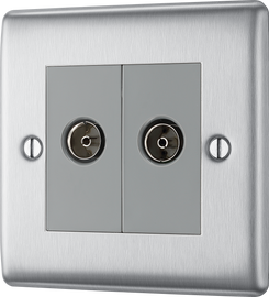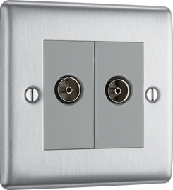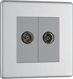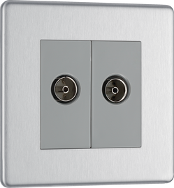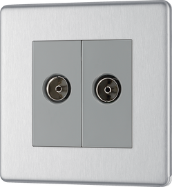 BG FBS63 Flatplate Screwless Isolated Co-axial Socket, 2 Gang, Brushed Steel - Grey Insert