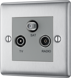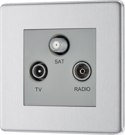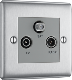 BG FBS67 Flatplate Screwless Triplex TV/FM/Sat socket - Screened, Brushed Steel - Grey Insert