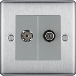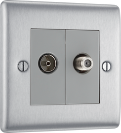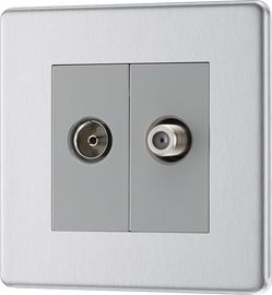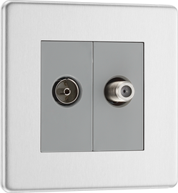 BG FBS65 Flatplate Screwless Satellite and Co-axial Socket, 2 Gang, Brushed Steel - Grey Insert