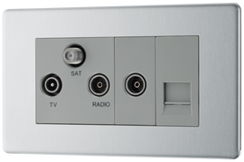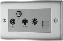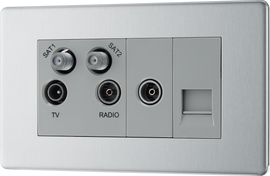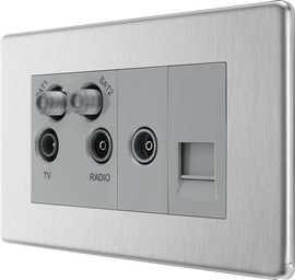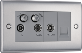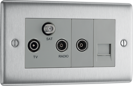 BG FBS68 Flatplate Triplex TV/FM/Sat Socket + Return & 1 Gang Tel. - Screened Brushed Steel - Grey Insert