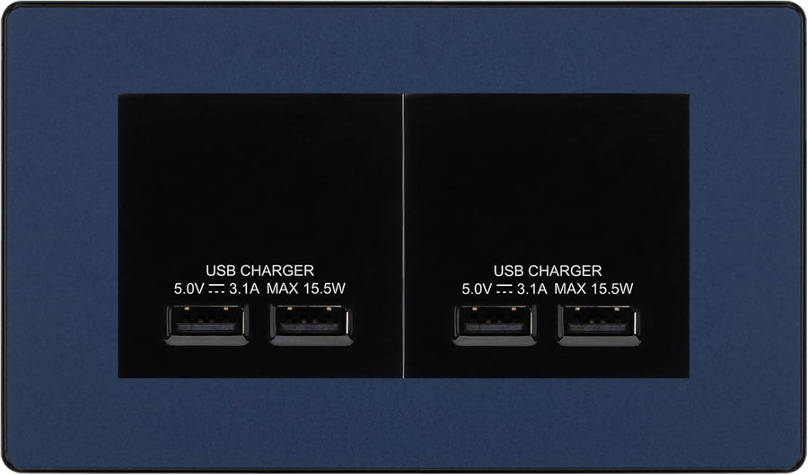 BG Evolve Matt Blue 4-Gang Euro Plate with 2X USB-A Dual Chargers – Black Insert